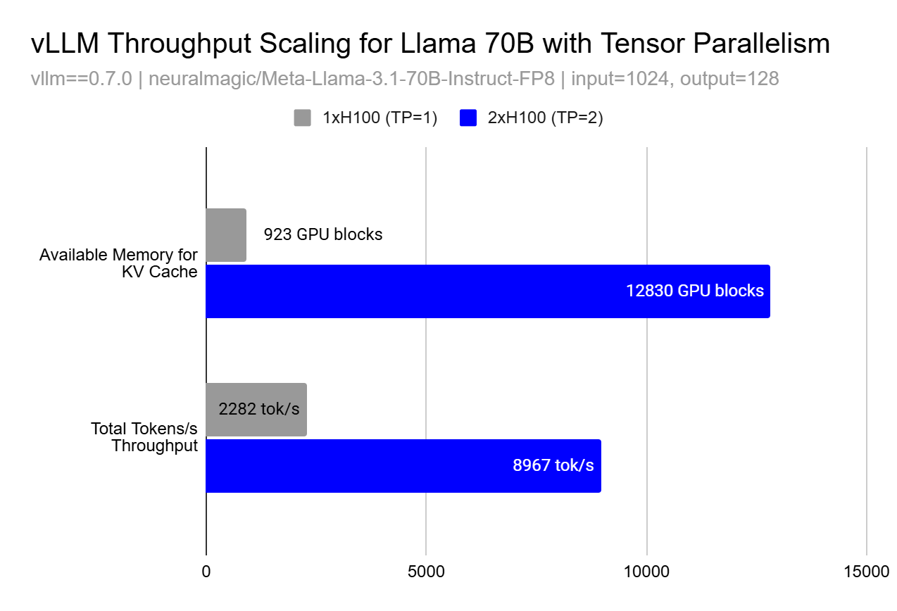 This super-linear scaling effect occurs because larger caches allow for larger batch sizes for processing more requests in parallel and better memory locality, resulting in improved GPU utilization beyond what might be expected from simply adding more compute resources. In the above graph you can see between TP=1 and TP=2, we are able to increase the amount of KV Cache blocks by 13.9x which allows us to observe 3.9x more token throughput - much more than the linear 2x we would expect from using 2 GPUs instead of 1.